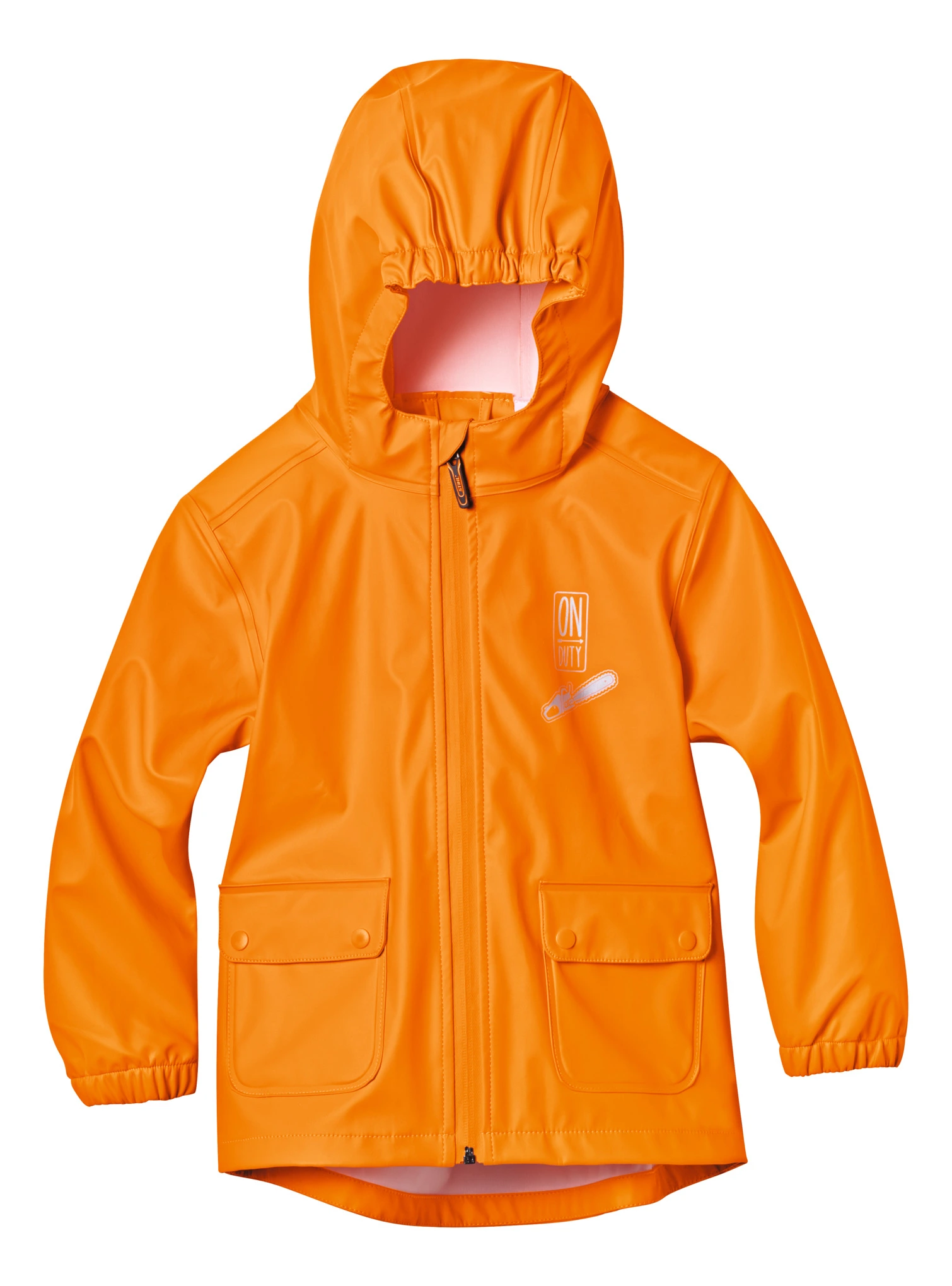 Πορτοκαλί αδιάβροχο μπουφάν, από 100% πολυεστέρα με επίστρωση πολυουρεθάνης, αδιάβροχο. Ανακλαστική μπροστινή εκτύπωση με αλυσοπρίονο, τύπωμα “ON DUTY” και λογότυπο STIHL. Με θερμοσυγκολλημένες ραφές.