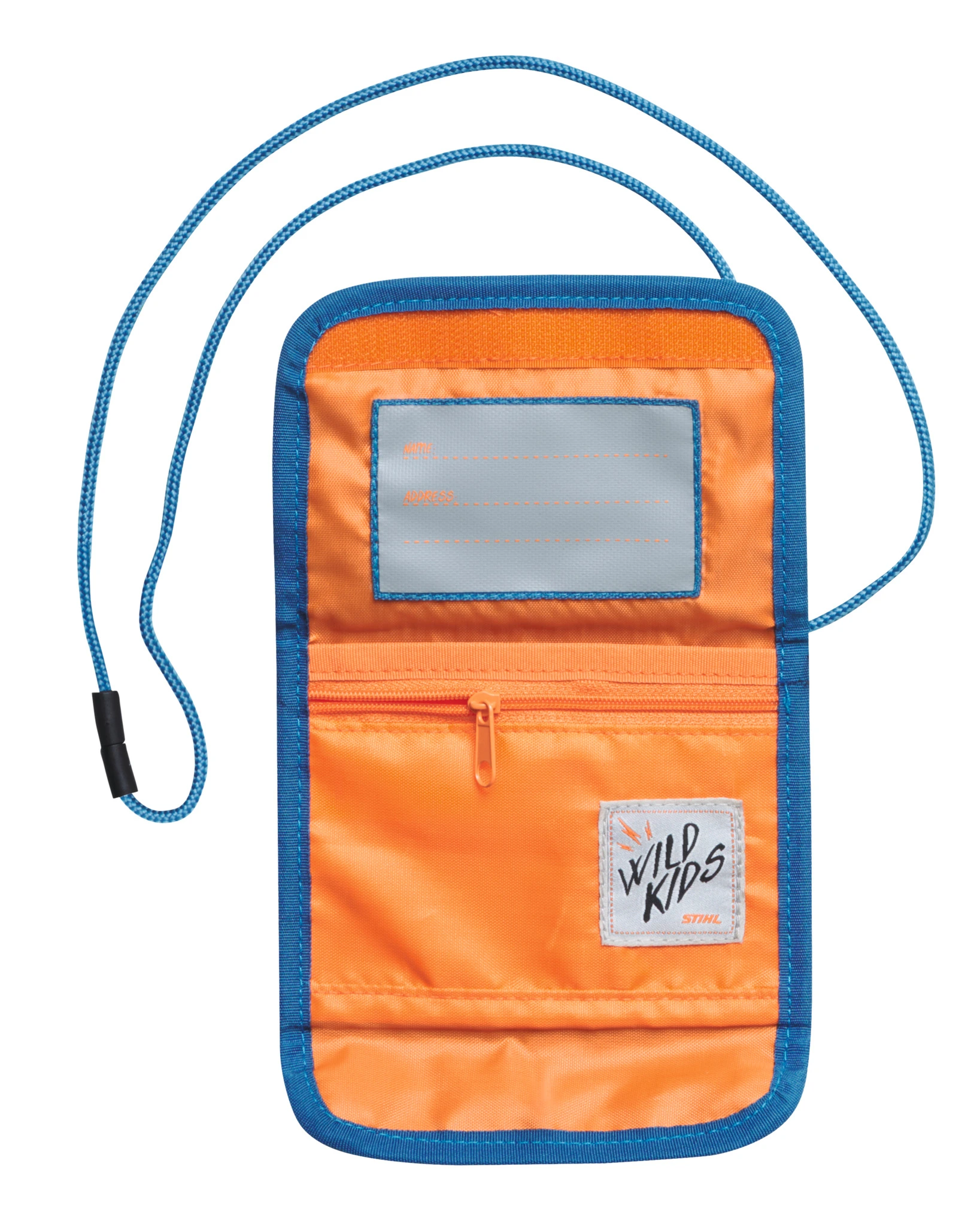 Για να μη χαθεί τίποτα στις εξερευνήσεις σας, υπάρχει το νέο μας πορτοφόλι «ADVENTURE» από πολυεστέρα που κρέμεται από τον λαιμό. Μπλε με πολύχρωμο σήμα «FUTURE LUMBERJACK» και πορτοκαλί φόδρα, είναι ιδανικό για χαρτζιλίκι.