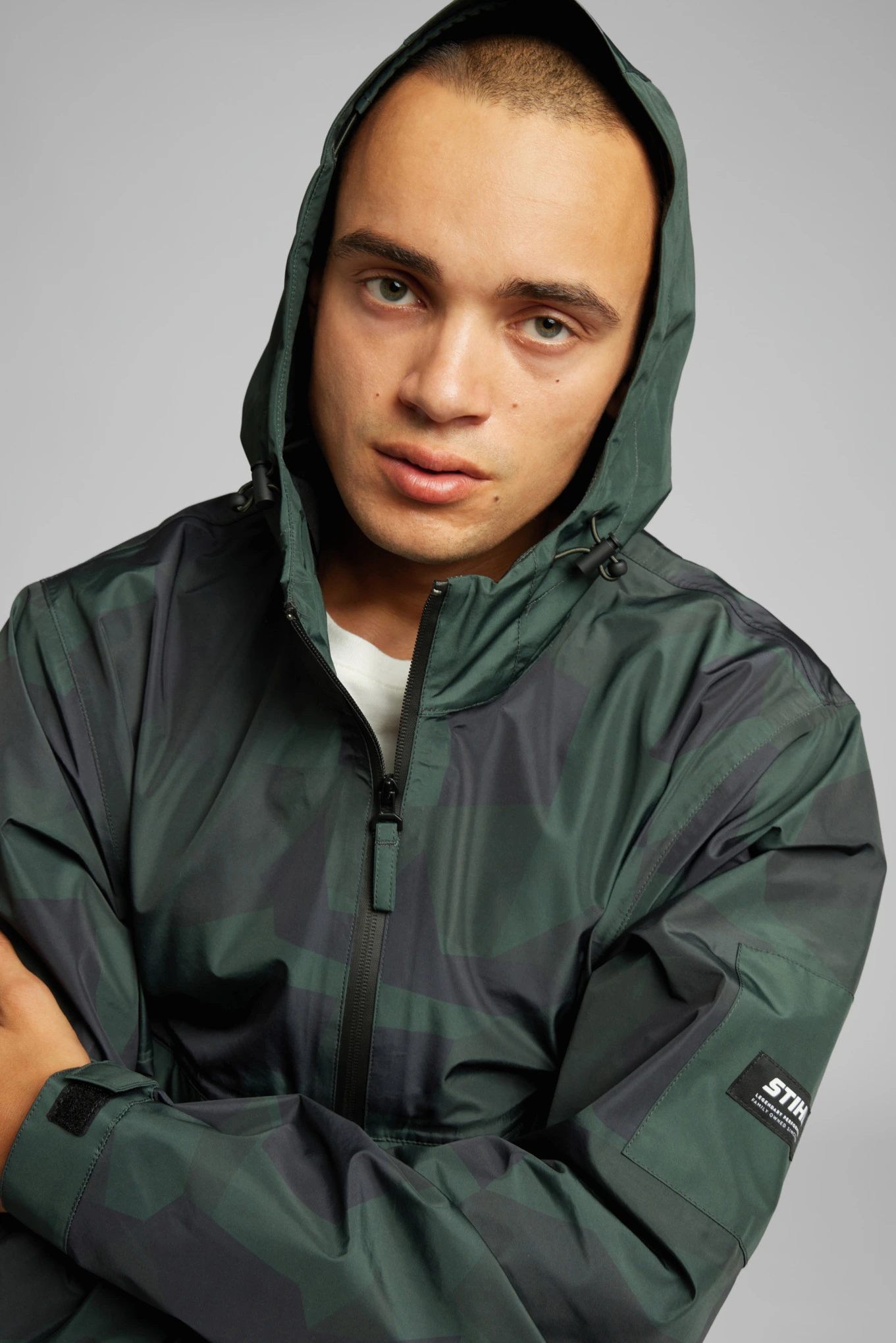 Πράσινο μπουφάν βροχής με εμφάνιση καμουφλάζ, με μεμβράνη TPU, στήλη ύδατος 5.000 mm και καλό αερισμό. Μπουφάν με σχεδιασμό πουλόβερ με φαρδύ λαιμό και πλαϊνό φερμουάρ, για να είναι εύκολο το τράβηγμα του ρούχου. Οι ραφές είναι επικαλυμμένες και τα μανίκια μπορούν να σφίγγουν επιπλέον με Velcro για να κρατούν τη βροχή μακριά. Η πρακτική μεγάλη μπροστινή τσέπη μπορεί να χρησιμοποιηθεί για την ασφαλή μεταφορά κλειδιών, κινητού τηλεφώνου, πορτοφολιού κ.λπ. στη βροχή. Στο αριστερό μανίκι υπάρχει μια μικρή υφαντή ετικέτα “LEGENDARY PERFORMANCE”.