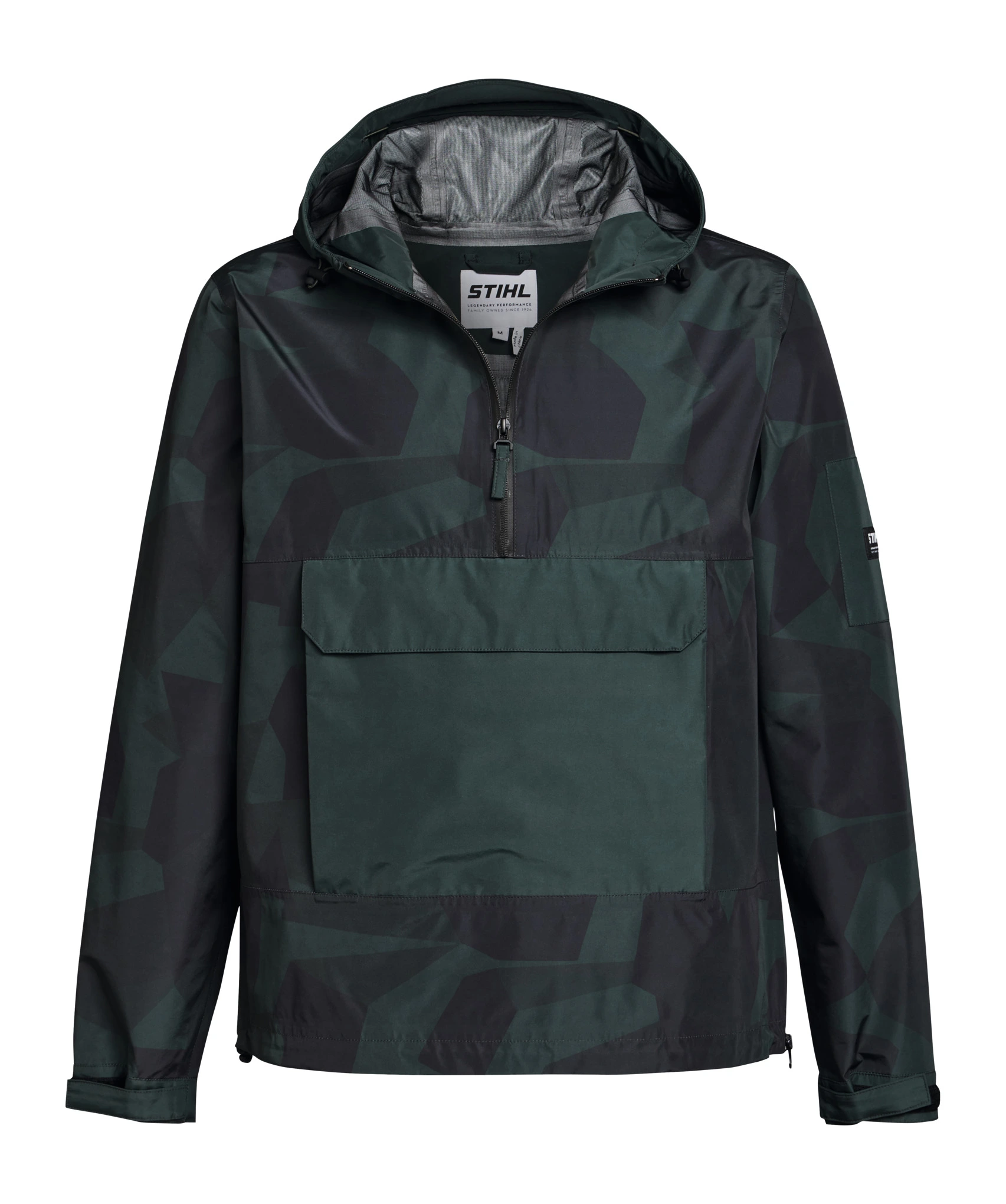 Πράσινο μπουφάν βροχής με εμφάνιση καμουφλάζ, με μεμβράνη TPU, στήλη ύδατος 5.000 mm και καλό αερισμό. Μπουφάν με σχεδιασμό πουλόβερ με φαρδύ λαιμό και πλαϊνό φερμουάρ, για να είναι εύκολο το τράβηγμα του ρούχου. Οι ραφές είναι επικαλυμμένες και τα μανίκια μπορούν να σφίγγουν επιπλέον με Velcro για να κρατούν τη βροχή μακριά. Η πρακτική μεγάλη μπροστινή τσέπη μπορεί να χρησιμοποιηθεί για την ασφαλή μεταφορά κλειδιών, κινητού τηλεφώνου, πορτοφολιού κ.λπ. στη βροχή. Στο αριστερό μανίκι υπάρχει μια μικρή υφαντή ετικέτα “LEGENDARY PERFORMANCE”.