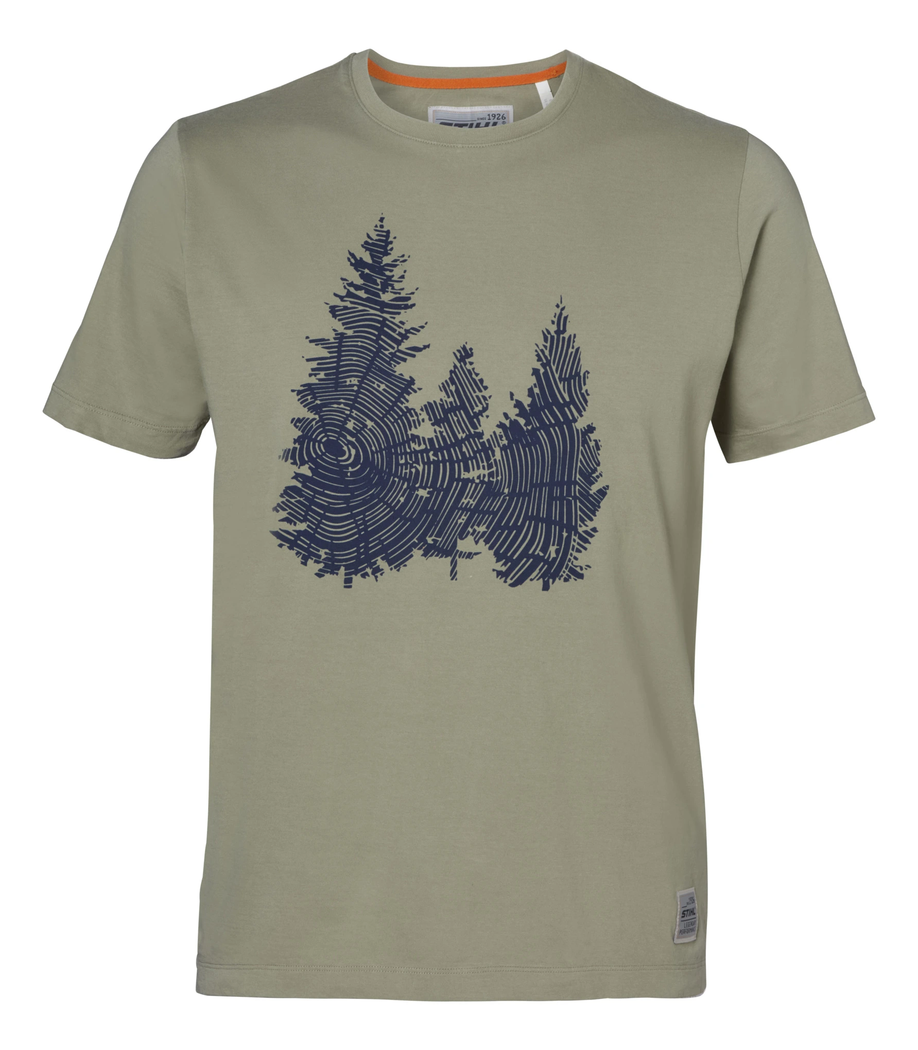 Χρώμα λάδι, 100 % βαμβάκι, στάμπα με σχέδιο ελάτων «FIR» στην μπροστινή πλευρά, εσωτερικές ραφές σε αντίθετο πορτοκαλί χρώμα.